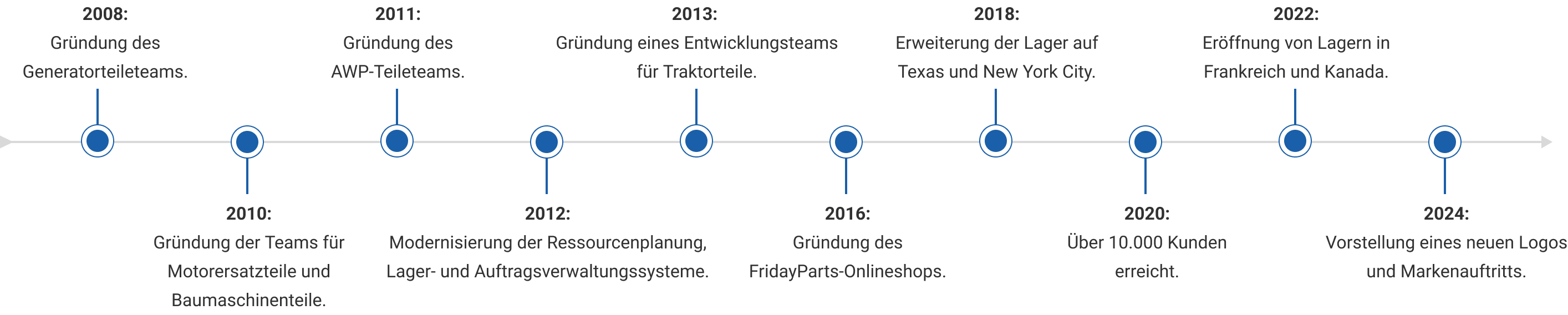 Im Jahr 2008 wandte sich Joseph aus Kamerun auf der Suche nach einem Ersatzteil für einen Generator an uns, was zur Gründung von FridayParts führte. Daher widmet sich FridayParts dem Ziel, die Suche nach Ersatzteilen einfacher und effizienter zu gestalten. 2010 erweiterten wir unser Sortiment um Motoren- und Baumaschinenteile. Ein Jahr später starteten wir unser AWP-Teileteam, um unser Angebot weiter zu diversifizieren. Im Jahr 2012 haben wir unsere Systeme aktualisiert, um reibungslose und effiziente Abläufe zu gewährleisten. 2013 haben wir Maßnahmen ergriffen, um eine bessere Trennung von B2C und B2B zu ermöglichen. 2016 haben wir den FridayParts Online-Shop gestartet, um den Kunden den Zugang zu verbessern. Unser Lager-Netzwerk wurde 2018 auf Texas und New York ausgeweitet. Bis 2020 haben wir stolz über 10.000 Kunden bedient. 2022 haben wir Lager in Frankreich und Kanada eröffnet. In diesem Jahr haben wir ein neues Logo und ein neues Markenaussehen eingeführt.