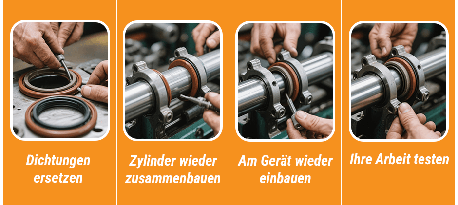 - Sind harte Teile wie Stange, Kolben oder Zylinder beschädigt, ersetzen Sie diese – neue Dichtungen helfen nicht.